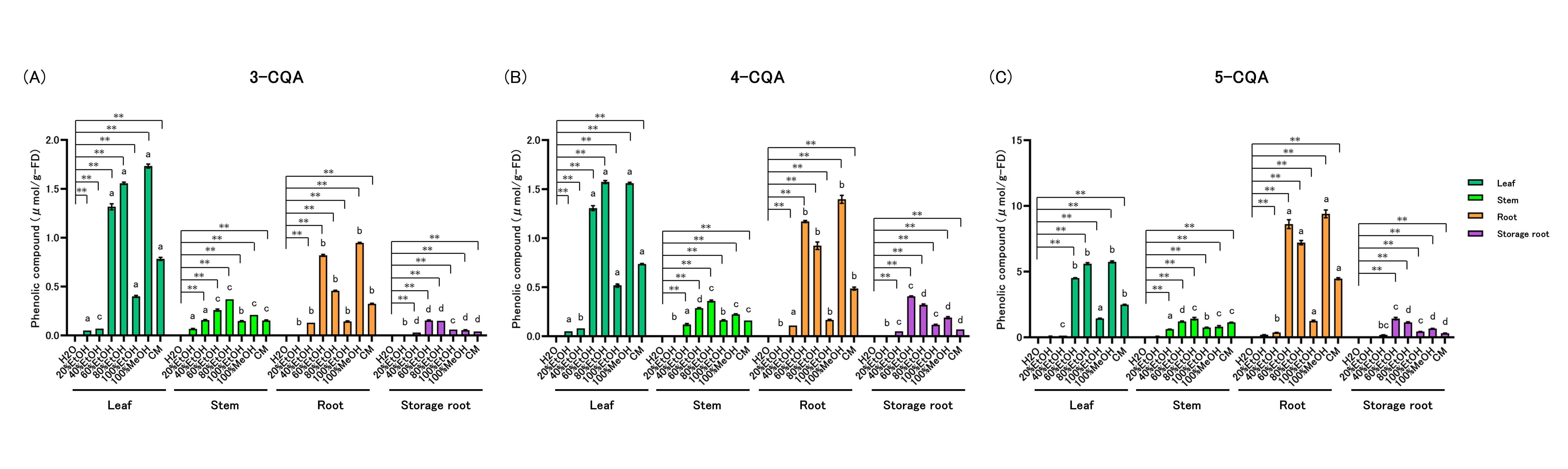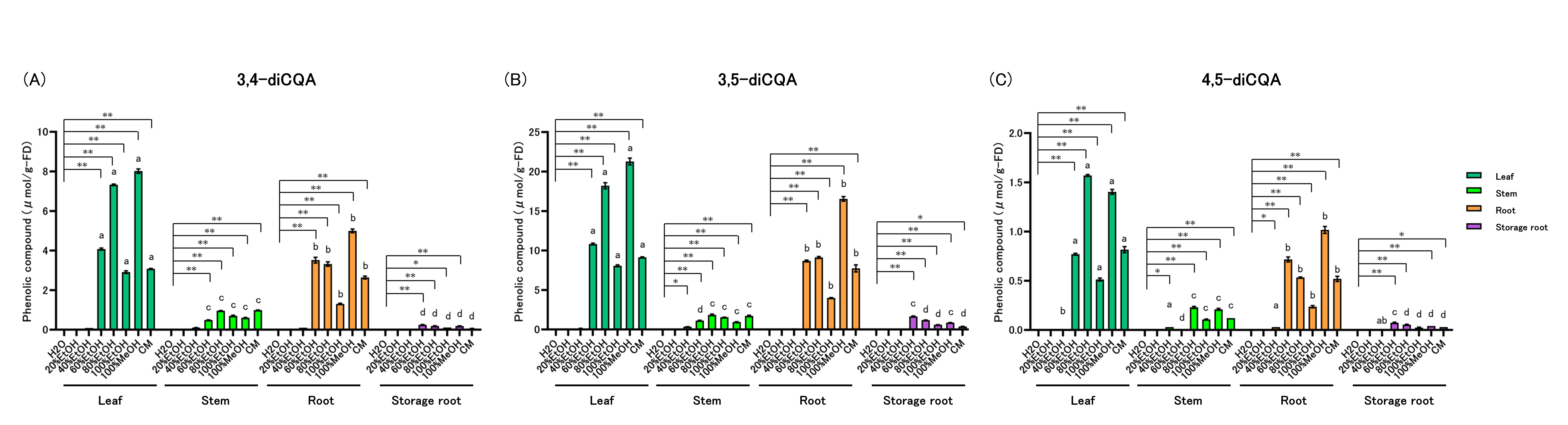 Levels of 3-CQA (3-O-caffeoylquinic acid) were quantified (Figure 4A, Supplementary Table 4). Within-part solvent effects: In leaves, 3-CQA was highest in 20–100% EtOH, 100% MeOH, and CM. In stems, roots, and storage roots, 3-CQA peaked in 40–100% EtOH, 100% MeOH, and CM. Across-part rankings within each solvent: In 20% EtOH, leaf = stem > root = storage root. In 40% EtOH, stem > root > leaf > storage root. In 60% and 80% EtOH, 100% MeOH, and CM, leaf > root > stem > storage root. In 100% EtOH, leaf > stem = root > storage root.