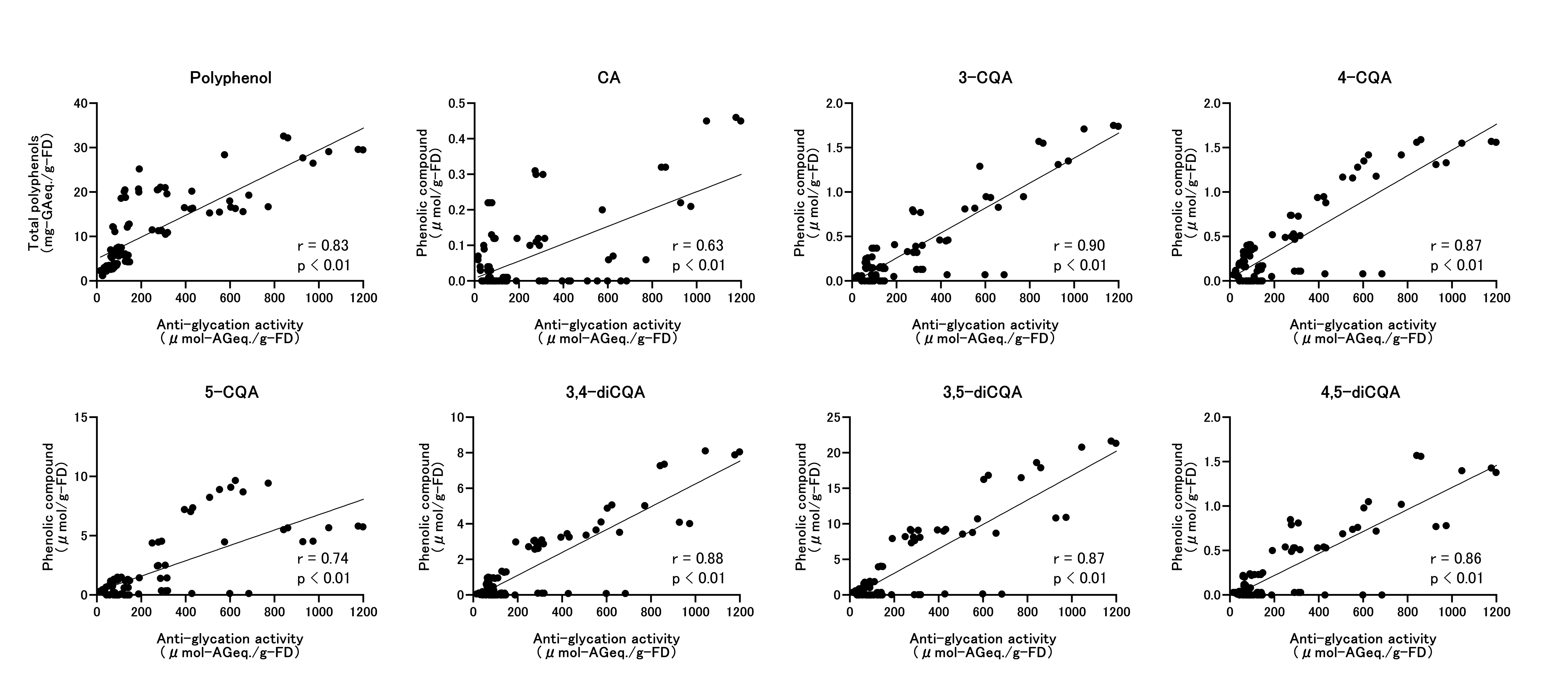 In this study, we prepared extracts from different sweet potato parts using a panel of solvents and evaluated their antiglycation activity. Leaves and roots showed strong activity, and diCQAs emerged as the principal contributors. Prior work has shown that green tea catechins and coffee chlorogenic acid suppress AGE formation [5, 6]. Our results extend this evidence by showing that CQAs abundant in sweet potato also inhibit glycation, indicating additional functionality of sweet potato–derived polyphenols. Across parts, leaves and roots were consistently more active than stems and storage roots, likely reflecting differences in the total polyphenol content and CQA profiles, as supported by the correlation and regression analyses. In particular, both leaves and roots contained high levels of 5-CQA, 3,5-diCQA, and 3,4-diCQA, mirroring their similar activity patterns.
