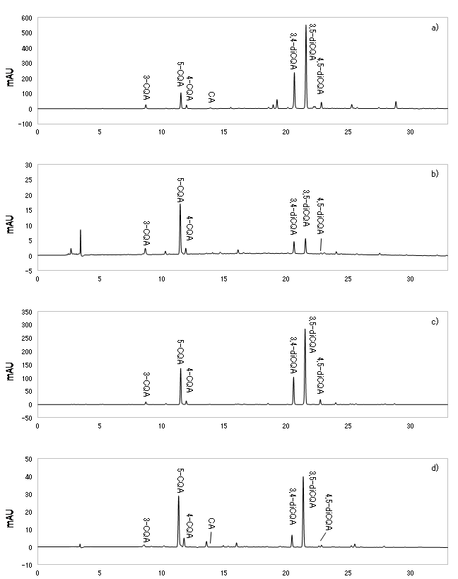 - Sasaki K, Oki T, Kobayashi T, Kai Y, Okuno S (2014) Single-laboratory validation for the determination of caffeic acid and seven caffeoylquinic acids in sweet potato leaves. Biosci Biotechnol Biochem. 78: 2073-80.