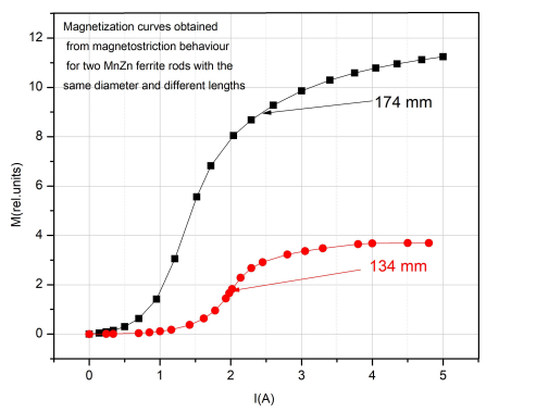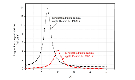 Magnetostriction MeasurementsBy experiment we evaluated the longitudinal magnetostriction on cylindrical samples of Mn0.75Zn0.25Fe2O4 ferrite. Measurements were made in dynamic mode, superimposing an alternative magnetic field of controlled frequency and amplitude over the constant field of the magnetization coil. Longitudinal magnetostriction was measured by optical interferometry using a Doppler vibrometer type VQ-400A. The analogic signal from VQ400A was acquired by a acquisition board USB NI 9215 and the value of longitudinal magnetostriction was evaluated from power spectrum of Fourier analysis. All measurements were made at the resonance frequency of the sample, which depends on the length of the cylindrical sample and naturally of the material. In Figure 6 we plotted two magnetostriction curves for two samples of the same material but different lengths: 174 mm and 134 mm.