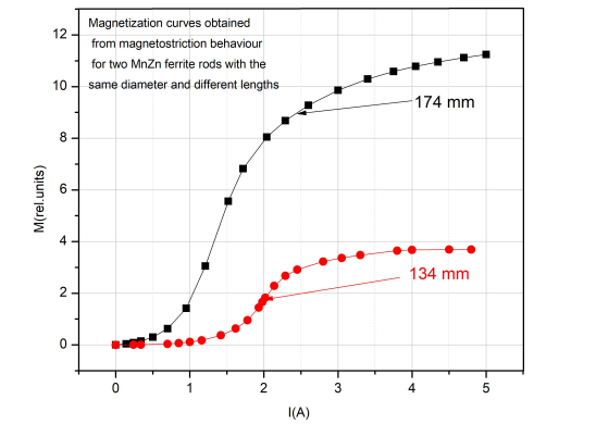 If we refer to the dynamic magnetostriction behavior, the magnetization curves for the same material but for two different lengths are plotted in Figure 10. This confirms that the magnetization curve is geometry of the sample dependent, and the demagnetizing field contribution when we bring the sample at saturation. In our case for the sample of length 134 mm, the saturation magnetization is Ms = 3528.4 emu.