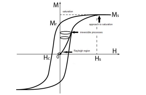 The magnetic structure of magnetic materials consists of magnetic do- mains, which are uniaxial wall spacing, closure domain and stripe domains. Domain walls separate one domain from another, inside the wall the magnetic spins change the orientation with angles according the type of the magnetic wall. There are three type of domain walls: Bloch walls, Neel walls and Cross-Tie walls [6]. The magnetization proces which appears when a de- magnetized ferromagnetic body is introduced in an external magnetic field is explained by connected phenomena referring to these magnetic domains and macroscopically explained by the hysteresis cycle. According to this cycle, the component of the macroscopic magnetization along the field direction, firstly increases nonlinearly with a low initial slope, then follows a drastic increase of this slope at intermediate magnetic fields, and then the slope de- creases at higher fields up to the technical saturation. This segment of the magnetization curve is called first magnetization curve. When the field is removed, the macroscopic magnetization decreases along a curve located well above the first magnetization curve. For zero field a noticeable magnetization generally remains, that is called remanence or remanent magnetization, Mr (according to Figure 1).