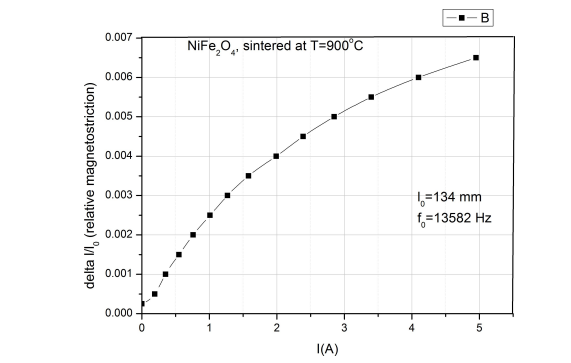 Ferrite class materials are frequently studied in order to control the mag- netostriction phenomenon and to use it in applications [11,12,17,18,21]. Being closely related to the magnetization process, for example, for a nikel ferrite NiFe2O4 the behaviour of the dynamic longitudinal magnetostriction follows the increasing of the magnetization’s sample, can reach maximum values and then it can decrease, depending on the applied magnetic field. In Figure 2 we have illustrated a part of such behaviour.