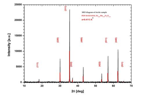 To prepare our samples we used the traditional method of obtaining fer- rites, the ceramic method, which involves chemical reaction at very high tem- peratures. Our MnZn ferrite sample with the formula Mn0.75Zn0.25Fe2O4 was obtained by a 12 hours heating cycle, during which a 1150 C constant temperature level for 4 hours for sintering was ensured. The sample was cooled by a free cooling process, in which the sample returned to room temperature after about 10 hours. In Figure 3 we illustrated the XRD spectrum and the crystallographic indices, by considering a spinel structure with a cu- bic elementary cell [13]. Taking into consideration a such arrangement with a cubic elementary cell and a wavelength of 1.5406 A o for X radiation, a latice constant of 8.4113A o is obtained.