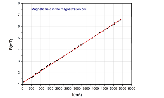 From Figure 4 we evaluated the value of saturation magnetization at room temperature 300K at Ms = 67.5 emu/g. Approximately the same value was obtained by magnetic fluxmeter measurements, made on small cylindrical samples, taking into account the longitudinal demagnetization factor effect [4,5]. By measuring the magnetic flux by axial placing of the measurement fluxmeter’s coil in the magnetization coil we obtained the magnetic induction B. The magnetic induction B0 of the magnetic field in the absence of the ferrite sample from the magnetizing coil was determined using a Hall teslameter. The profile of the magnetic field inside the empty magnetizing coil was also determined; the magnetic field in the center of empty magnetization coil for different values of dc electrical current is illustrated in Figure 5.