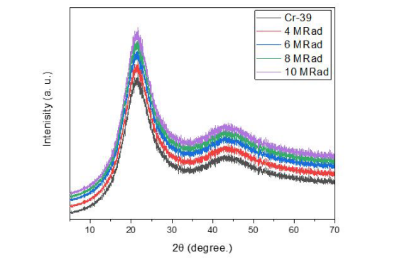 Moreover, a rise in peak intensity and an increase in the full width at half maximum (FWHM) are detected from the diffraction of irradiated Cr-39 polymer, which is often correlated with an increase in the degree of crystallinity of the polymer.