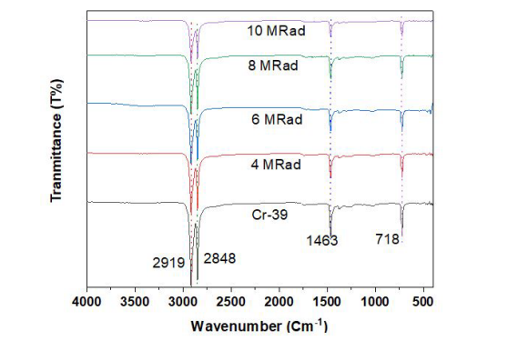 FT-IR spectroscopyFT-IR spectroscopy is a helpful technique for studying the physical and chemical properties of polymeric materials after irradiation. The variations were calculated based on the relative rise or decrease in the intensity of the characteristic bands associated with the functional groups contained in the polymers. The FT-IR transmittance spectra (in AT-IR mode) of the unirradiated Cr-39 and Cr-39 irradiated with 4, 6, 8, and 10 Mrad in the wavenumber range 4000-400 cm-1 at room temperature shown in Figure (1).