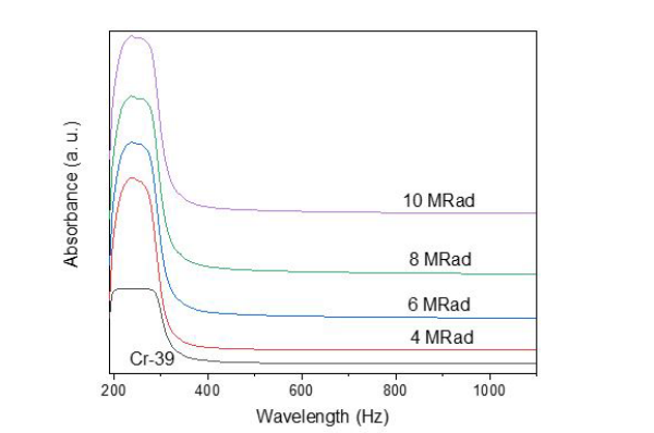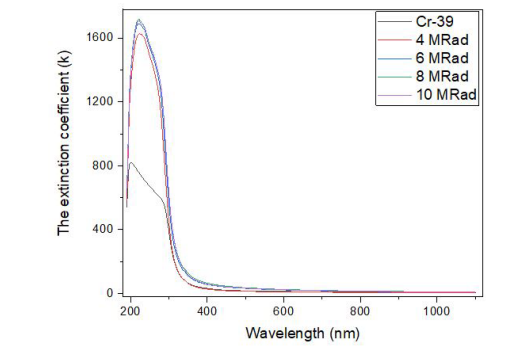 Optical propertiesFigures (2 and 3) show the absorbance and transmission spectra of the unirradiated Cr-39 and Cr-39 irradiated with 4, 6, 8, and 10 Mrad in the wavelength range 190-2500 Hz at room temperature, which studies the optical properties of samples before and after irradiation.