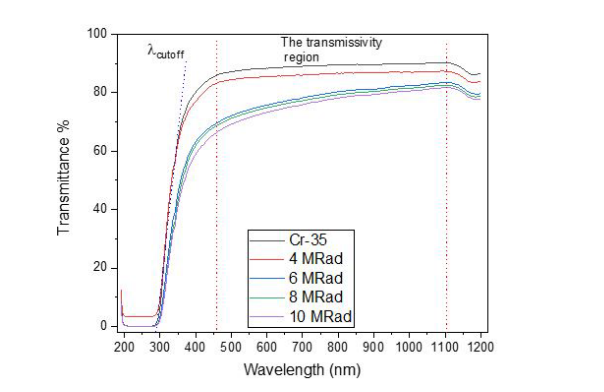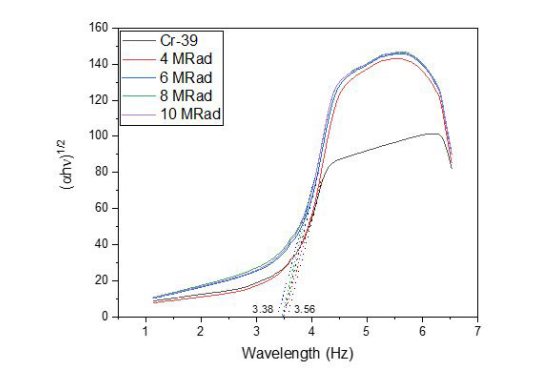 Meanwhile, the optical transmittance increases with increasing wavelength and gradually increasing radiation doses. Moreover, a red shift in cutoff wavelength (λcutoff) is seen following irradiation, indicating that the fundamental absorption edge of the examined samples has decreased.