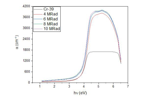 where t is the thickness of the sample, R is the absorbance, and T is the transmission. Figure (4) shows the absorption coefficient (α) of prepared samples. Strong absorption is observed for all samples with the increase in energy through the UV-Vis region, attributing to the electronic transitions in this spectral region. The spectrum of pure Cr-39 polymer depicts its presence of a π-π* transition that appears at 199 nm (3.71 eV). In addition, the activation energy of the irradiated samples decreased with increasing irradiation doses at 221 nm to 3.71 eV.