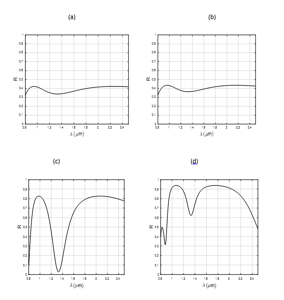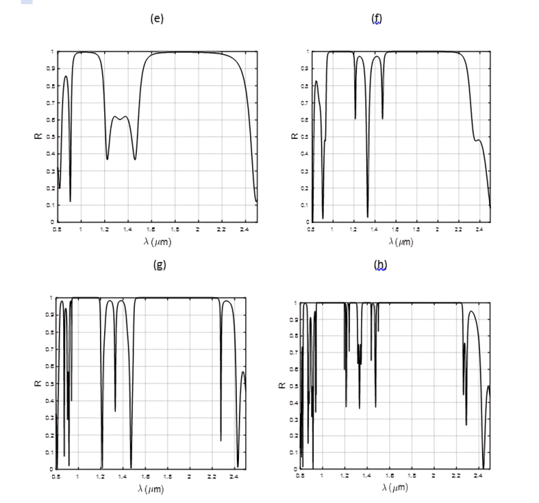 We presented in Figure. 4 the calculated reflectance spectra at normal incidence, obtained using the transfer matrix method for a Fibonacci quasi-periodic one-dimensional photonic crystal. This crystal is based on an arrangement of silica (SiO₂) and silicon (Si) layers, with a low refractive index (nL=1.45) and a high refractive index (nH =3.4), respectively. The thicknesses (d_H) and (d_L) for the SiO₂ (L) and Si (H) layers must satisfy the Bragg condition: