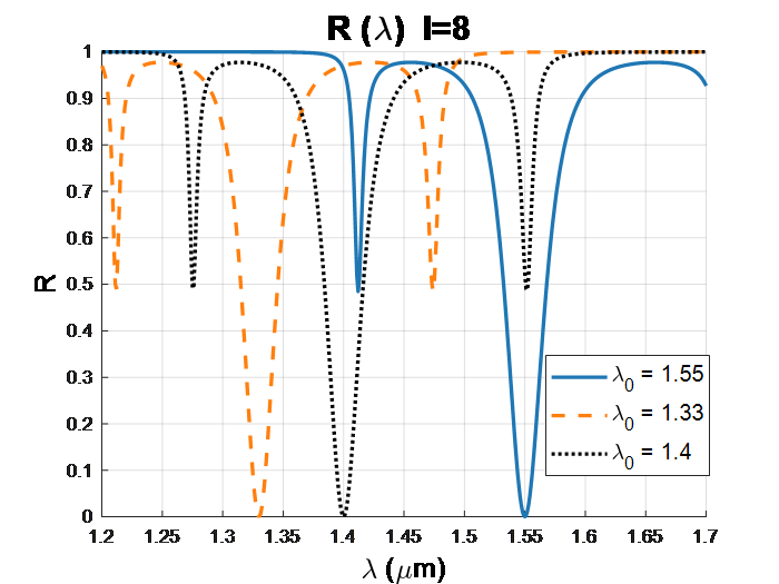 Figure 5 shows the evolution of the width of photonic bands as a function of wavelengths for the eighth iteration (I=8 ) using different thicknesses corresponding to the three reference wavelengths λ0, which are respectively equal to 1.4, 1.33, and 1.55 µm to satisfy the Bragg condition. We chose these three specific wavelengths 1.33, and 1.55 µm the two corresponding to telecommunication bands and 1.4 µm an intermediate value between them to evaluate the effect of the layer thickness on the position of the transmission peak, while satisfying the Bragg condition.