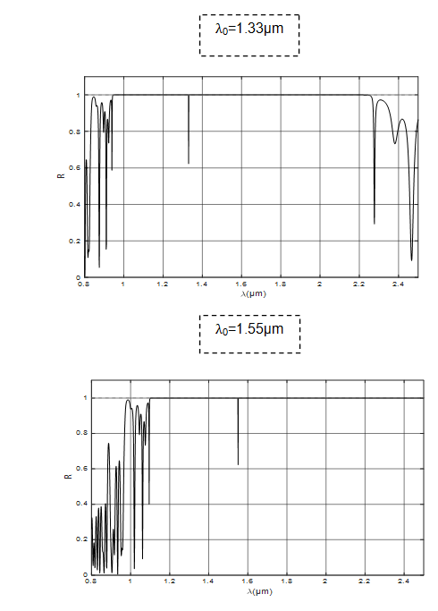 We determined the optimal values of j and i. We set the values of j to 7 and i to 8 to study the optical properties of this system. The following Figurer shows the reflection spectra of the Br (7)/FS (8)/Br (7) system at normal incidence for two different reference wavelengths: 1.33 µm and 1.55 µm: