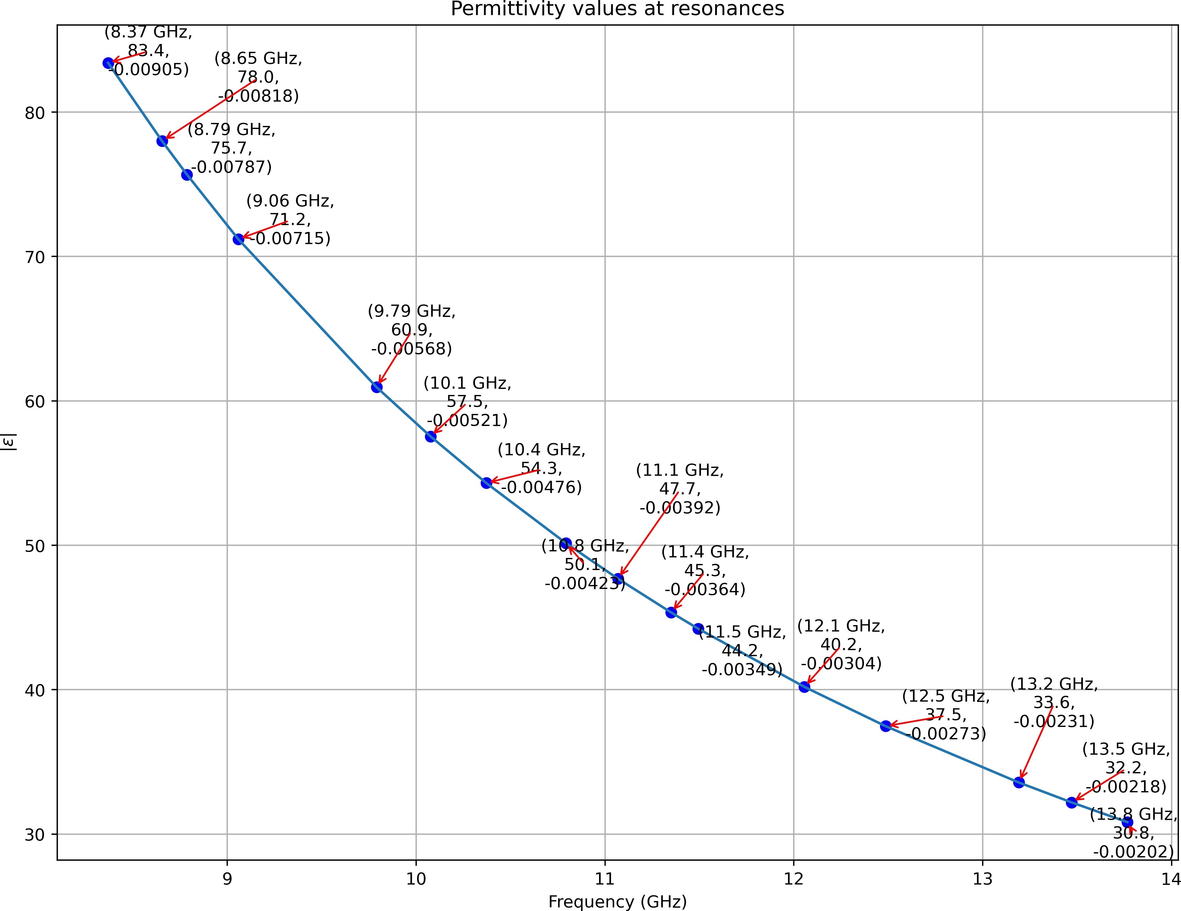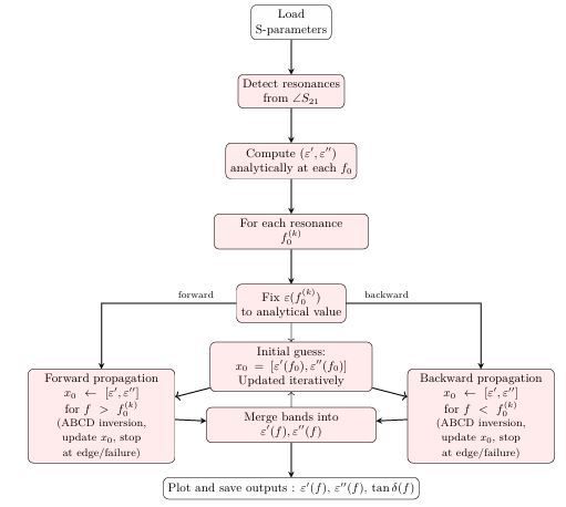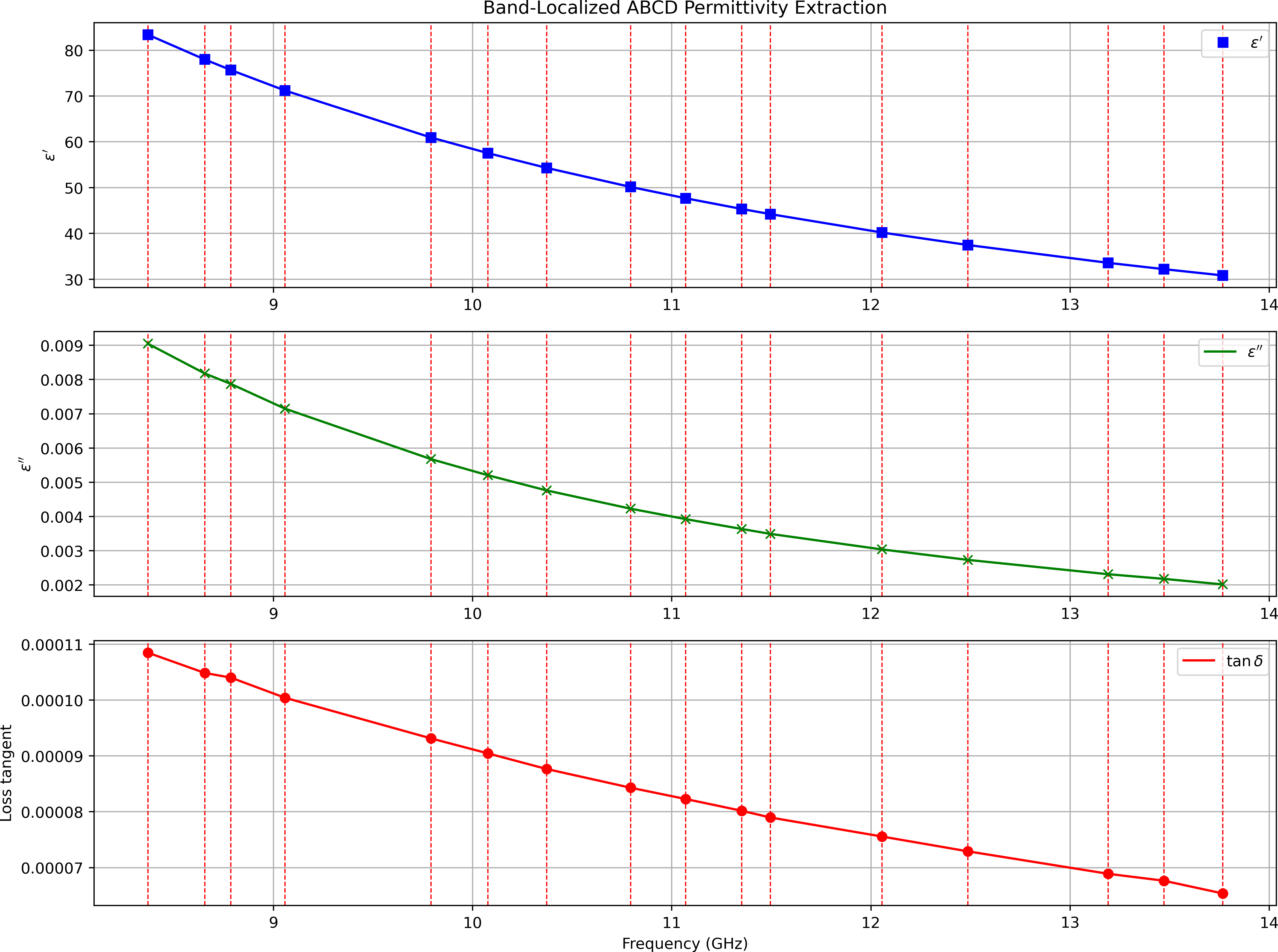 Guided ABCD Inversion: From each anchor, ε(f ) is propagated bidirectionally over a 364 MHz neigh- borhood (±182 MHz) using a least-squares fit of a transmission-line ABCD model to the measured S- parameters. Propagation halts at band edges or upon optimization failure, ensuring numerical stability. Overlapping neighborhoods from adjacent resonances naturally merge into a continuous, monotonic profile across 8.00 GHz to 14.0 GHz.
