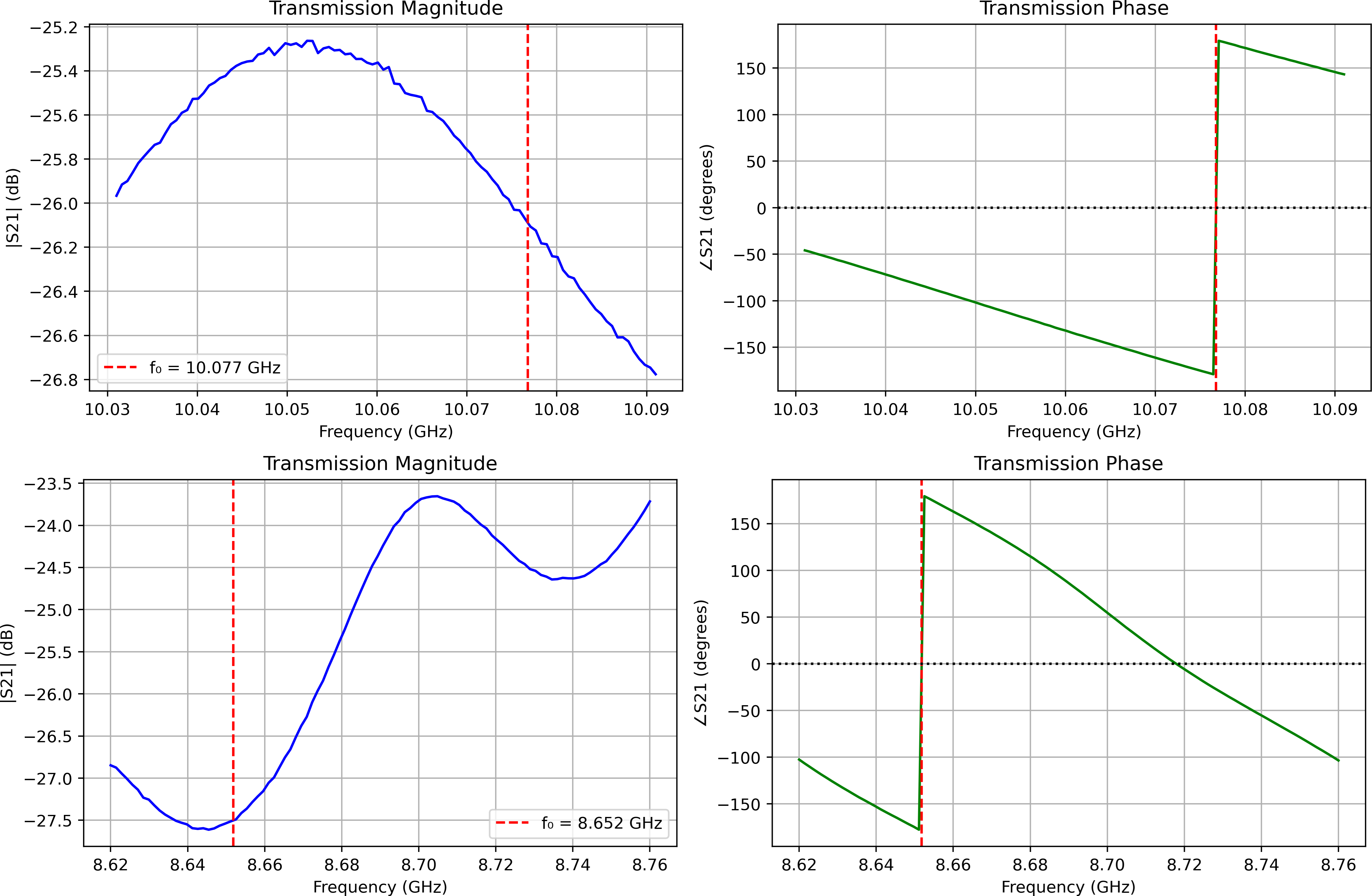 Dielectric loss is captured through the imaginary part ε′′, derived from the loaded quality factor QL, which reflects total energy dissipation in the resonant system. Using the phase response of the transmission coefficient, QL can be approximated as [9, 10]: