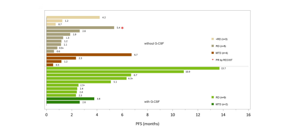 EfficacyAll 26 treated patients were evaluable for efficacy: 15 patients with lurbinectedin without primary G-CSF prophylaxis and 11 with lurbinectedin with primary G-CSF prophylaxis (Table 4). A swimmer plot depicting individual PFS of all patients treated with and without primary G-CSF prophylaxis by dose level is provided in Figure 1.