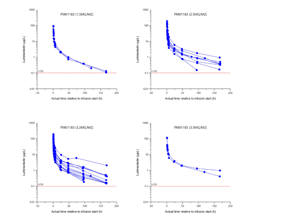 Pharmacokineticsll patients were sampled for PK analysis and were suitable for non-compartmental Analysis (NCA). Individual lurbinectedin total plasma concentration-time pro- files grouped by dose level are shown in Figure 2. Parameters obtained for lurbinectedin at each dose level are shown in Table 5.