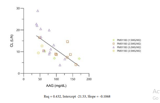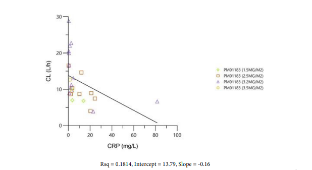 The mean (standard deviation) of total body clearance (CLt ) at dose levels of 1.5, 2.5, 3.2 and 3.5 mg/m2 was of 8 (1.9), 9.9 (4), 15 (7.4) and 11 (2.3) L/h, respectively. Total body clearance of lurbinectedin in patients treated with 3.2 mg/m2 was the highest among the four dose levels tested, most likely due to low levels of alpha-1-acid glycoprotein (AAG) and C-reactive protein (CRP), which are known to correlate with high lurbinectedin CLt , rather than to dose-dependent PK of lurbinectedin. The relationship between CLt and those covariates was confirmed in the present study (Table 5).