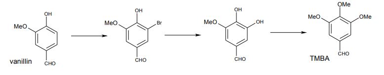 vanillin -> bromovanillin 98% / bromovanillin -> syringaldehyde 91% / syringaldehyde -> TMBA 95%