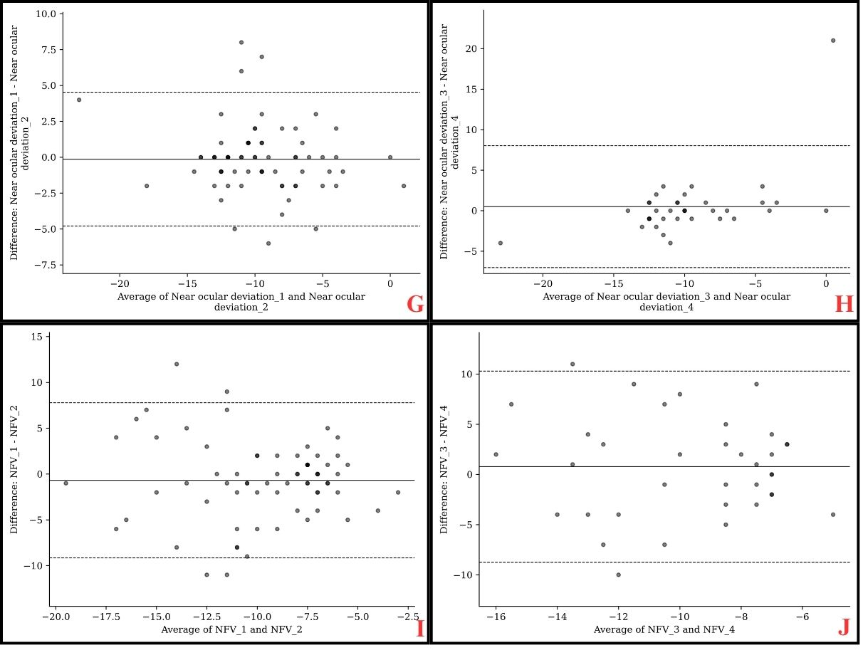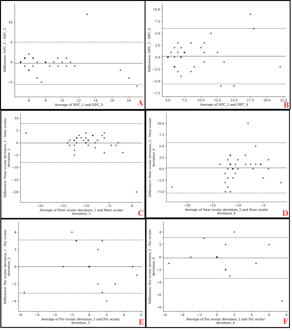 Correlation coefficients were calculated for all quantitative measurements (Table 2). Strong and very strong correlations were observed for NPC and both near and far ocular deviation. For PFV, tests conducted for repeatability demonstrated very strong correlations, while those for reproducibility showed moderate correlations. However, all NFV tests showed lower correlations in both repeatability and reproducibility analyses.