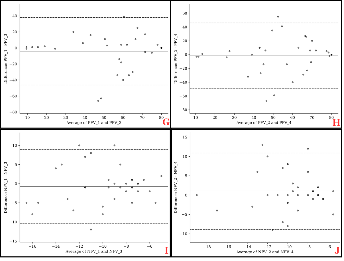 Repeatability was evaluated by comparing intra-examiner measurements, specifically between test sessions 1 and 2, and between sessions 3 and 4. Overall, a good level of agreement was observed, with negligible mean differences between repeated measurements for the NPC (0.03 ± 4.70 cm and 0.42 ± 2.89 cm), distance phoria (0.09 ± 1.71 PD and 0.33 ± 1.49 PD), and near phoria (0.13 ± 2.40 PD and 0.50 ± 3.90 PD). (Tab.3) Nevertheless, the limits of agreement (LoA), which reflect the range of measurement variability, should be carefully considered in clinical practice: ±9.00 cm or ±5.50 cm for NPC, ±3.00 PD or ±2.50 PD for distance phoria, and ±4.50 PD or ±7.50 PD for near phoria. (Figure 1) Regarding PFV, intersession agreement was acceptable, although the mean differences between test sessions were larger (4.11 ± 15.40 PD and 1.64 ± 11.51 PD) (Table 3). Measurement variability was substantial, with a LoA of ±30.00 PD or ±22.00 PD, indicating that caution should be exercised when interpreting individual results in routine clinical settings. (Figure.1) For NFV, agreement was weak, despite small mean differences between sessions (0.69 ± 4.35 PD and 0.78 ± 4.93 PD) (Table 3). The LoA revealed considerable variability for this parameter (±8.50 PD or ±9.50 PD), suggesting that NFV measurements may be less reliable across repeated assessments (Figure 1).