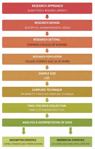 The present study adopted a quantitative research approach with a descriptive, non-experimental research design to assess the level of nomophobia among nursing students. The study was conducted at Stephens College of Nursing jammu. The population comprised nursing students, with the target population including students aged 18 to 25 years studying at the selected college. The accessible population consisted of nursing students within the same age group who were available during the period of data collection. A probability stratified sampling technique was used to select the participants. The sample included 130 nursing students aged 18 to 25 years. Students who were present during data collection, willing to participate, and owned mobile phones were included in the study, while those who were absent or unwilling to participate were excluded. The systematic representation of the research methodology used in the study are shown in figure 1.