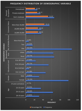 The frequency distribution of demographic variables provides a comprehensive overview of the characteristics of the respondents included in the study (Table 3). The gender-wise distribution indicates that a large majority of the respondents are female (76.15%), while males constitute 23.85% of the total sample. This shows a higher participation of female students in the study. Age-wise classification reveals that most respondents belong to the 20–21 years age group (48.46%), followed by 22–23 years (26.92%) and 18–19 years (23.85%). Only a very small proportion of respondents are aged 24 years and above (0.77%), indicating that the sample largely consists of young adults.