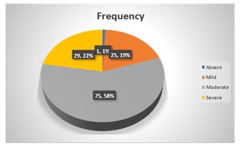 The frequency distribution illustrated in the Figure 3, indicates that most respondents fall within the moderate category, accounting for 75 cases or 58% of the total. This suggests that the condition being assessed is commonly experienced at a moderate level among the population. The severe category represents the second largest proportion, with 29 cases (22%), highlighting a substantial group facing more serious levels of the condition. Meanwhile, mild cases account for 25 respondents (19%), indicating that nearly one-fifth experience the condition at a lower intensity. In contrast, the absent category is negligible, with only 1 case (1%), showing that very few respondents report no presence of the condition. Overall, the distribution emphasizes the predominance of moderate to severe cases.