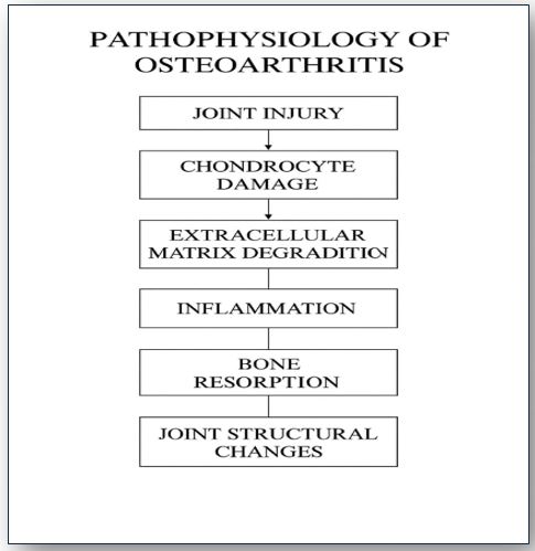 A degenerative cascade of progressive cartilage loss that results in bone damage is the hallmark of osteoarthritis. Osteophytes, subchondral plate thickening, and subchondral cysts are characteristic findings. Joint collage is broken down by proteolytic enzymes like matrix metalloproteinases, serine proteases, and cysteine proteinases that are induced by interleukin-6, monokines, interferon-induced protein-10, and macrophage chemotactic protein. The cartilaginous matrix becomes thinner and eventually disintegrates when the surrounding articular cartilage calcifies. Additionally, a decline in chondrocyte function is linked to aging, increasing the risk of osteoarthritic degeneration [20].