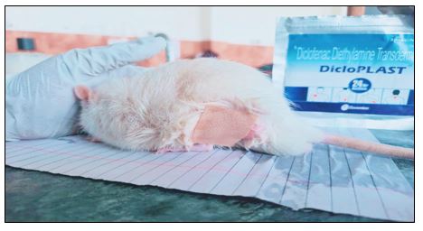 Male albino rats with artificially generated arthritis were used in this investigation to evaluate the ibuprofen transdermal patch in vivo. The left knee joint was injected intraplantarly with a kaolin and carrageenan suspension to simulate the subacute joint inflammation and edema that are typical of arthritic diseases. Three (n = 6) groups of animals were randomly assigned to each of the following: The Normal group (non-arthritic, untreated), the Standard group (arthritis-induced, treated with commercialized diclofenac patch), and the Treatment group (arthritis-induced, treated with the developed ibuprofen transdermal patch).