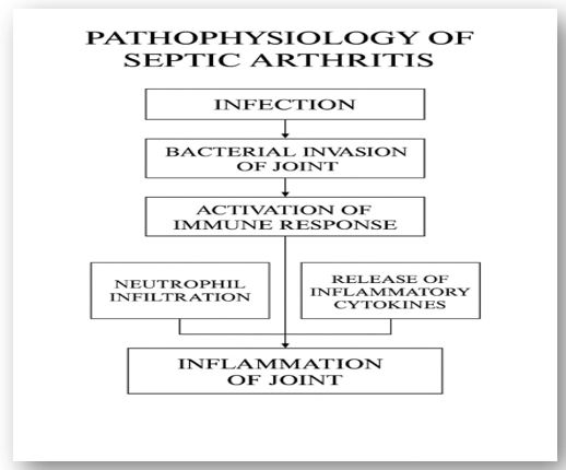 An inflammatory reaction to a monobacterial infection is usually the cause of septic arthritis. Cytokines, chemokines, and proteases are released when bacteria enter the synovial fluid, breaking down cartilage and causing the synovial membrane to swell. Bacterial toxins also have a detrimental effect on the joint space itself. The most prevalent pathogen in adults is Staphylococcus aureus, though streptococci strains are also prevalent. Gram-negative bacterial infections are more frequently observed in the elderly and very young, as well as in those who have experienced trauma, intravenous drug use, or immunosuppression [23].