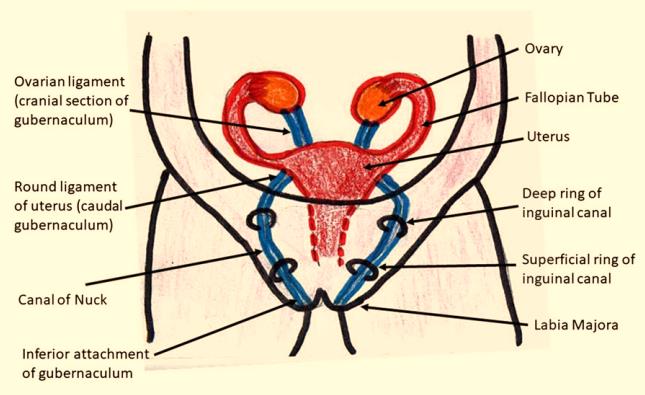 The canal of Nuck hydrocele is a disease of embryological origin involving both the processus vaginalis and the gubernaculum [10]. During the eighth to twelfth week of fetal development, a fibromuscular structure known as the gubernaculum emerges in the fetus. This structure continues down to the groin area of the fetus. In males, the distal part of the gubernaculum continues to expand to provide room for testicles to descend into the scrotum [1]. However, the absence of androgen prevents the expansion of the gubernaculum in females, which enables the gonadal tissue typically found in the pelvis to remain there [11].