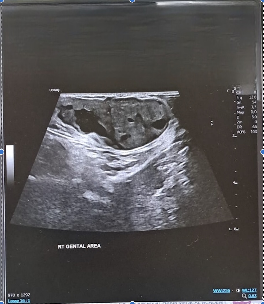 Numerous medical specialists regard ultrasonography as the most effective modality for the initial imaging of canal of Nuck anomalies. This condition typically presents on ultrasound as a well-defined anechoic lesion exhibiting posterior acoustic amplification, which is characteristic of a hydrocele [3,16]. Figure 2 illustrates the ultrasonographic findings associated with all three types of anomalies. During an ultrasound examination, a lesion may appear hypoechoic or generate low-level echoes due to an elevated protein concentration. In instances where complications arise from a hydrocele, such as infection or hemorrhage, the lesion is likely to exhibit a complicated appearance, characterized by echogenic content, a thickened wall, or internal septations. This is indicative of an increased likelihood of such complications. The presence of a giant cyst may be connected to a smaller cyst with thin walls; both cysts may respond to the pressure applied by the transducer, potentially resulting in a "cyst-in-cyst" appearance, which could lead to misdiagnosis. To differentiate these findings from those of an imprisoned bowel loop, it is essential to utilize Doppler ultrasonography, which can provide clarity regarding the absence of visible color flow within the lesion [16,17].