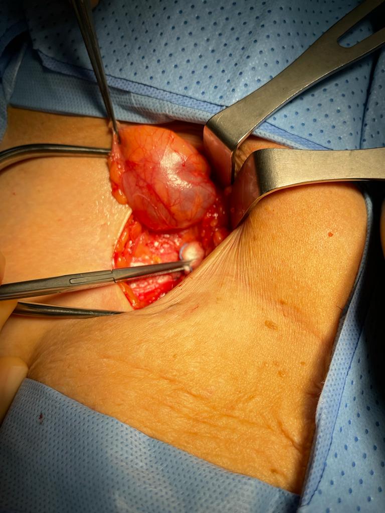 Depending on the circumstances, if an inguinal hernia is discovered simultaneously, a hernia repair may be performed concurrently, with or without mesh insertion. When the mass extends to the labia majora, an extra vulva repair could be recommended as a treatment option. An intraoperative photograph of a hydrocele of the canal of Nuck is shown in Figure 3.