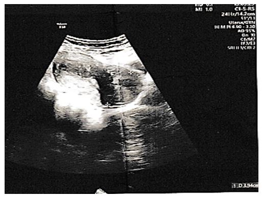 The history of the disease dates back to 2 years earlier marked by menometrorrhagia, with a history of multiple transfusions (a previous hemoglobin level of 4 g/dl) and a long history of taking progestogens without any notable effects. The patient was admitted for the purpose of hemodynamic stabilization with exploration of the symptoms, the ultrasound of the pubic area found a voluminous cervical mass of 3*4 cm.