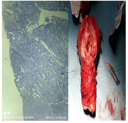 The gynecologic oncology decision was to perform an enlarged lymphadenectomy colpohysterectomy (CHEL) with ovarian transposition and adjutant radiotherapy. Macroscopically, at the opening of the uterine lumen, the presence of a pinkish-white tumor proliferation protruding from the cervix was noticed, anatomical pathology revealed a grade 1 endometrioid carcinoma of the uterine body with invasion of less than 50% of the myometrium, the cervix parameters were unharmed. An actual image of the surgical specimen and another taken under an electron microscope are attached.