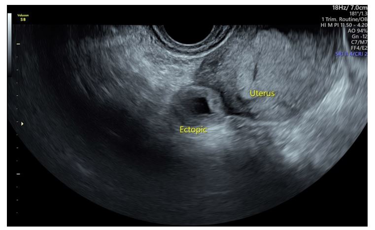 The TVUS (Figure 1) revealed a right sided ectopic pregnancy.