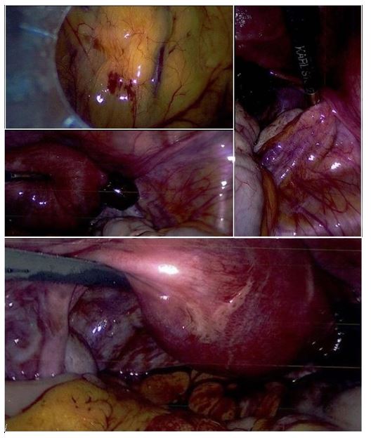 Given the TVUS findings, the decision was made to take the patient to theatre for a diagnostic laparoscopy; intraoperatively a right sided tubal stump ectopic was removed (Figure 2). On day 11-post operation, she experienced PV bleeding that was deemed menstruation and had blood tests taken on day 17-post operation, which showed no abnormalities. A repeat hCG was not performed.