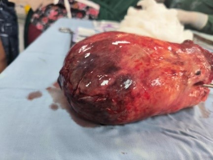 An anterior incision was made at the level of the constriction ring via the abdominal approach, allowing careful enucleation of the fibroid inserted at the uterine fundus. The gross specimen of the leiomyoma is depicted in Figure 1. The inverted uterine fundus was then restored to its normal position. The underlying endometrium and myometrium were meticulously repaired using 2-0 chromic absorbable sutures, thereby restoring the integrity of the uterine cavity. An intraoperative view of the inverted uterus being managed through the laparotomy is shown in Figure 2.