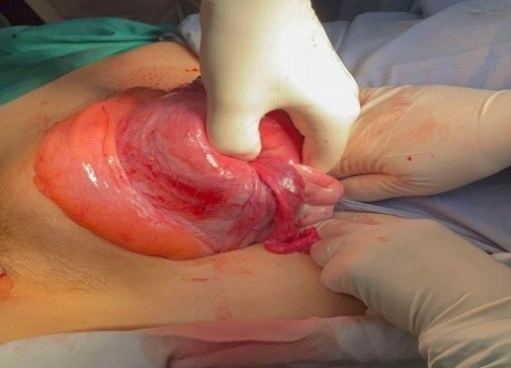 In the operating room, after induction of general anesthesia, a suprapubic laparotomy was performed. Intraoperative exploration showed an invaginated uterus with a depressed fundus pulled downward, an appearance highly suggestive of non-puerperal uterine inversion. Correlation with clinical findings (non-palpable uterus on abdominal examination and pedunculated vaginal mass) confirmed the diagnosis.