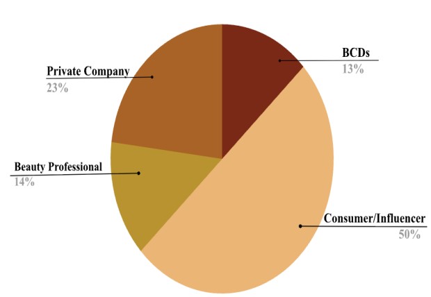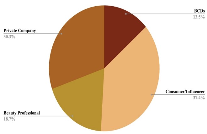In total, the videos amassed 467.2 million views. Private companies received the most views, with over 208 million views, followed by influencers (134.7 million), then beauty professionals (89.6 million), and lastly BCDs (38.3 million) (Figure 2). As for likes, the videos totaled 15.4 million likes, with consumers/influencers receiving 5.8 million likes, private companies receiving 4.7 million likes, beauty professionals receiving 2.9 million likes and BCDs receiving 2.1 million likes (Figure 3). As for shares, the videos totaled 847.3 thousand. Consumers/Influencer content was shared 495.2 thousand times, private companies 210.8 thousand, beauty professionals 77.8 thousand, and BCDs 63.5 thousand. There was a total of 122 thousand comments across all videos, with consumers/influencer content receiving 63.3 thousand comments, private companies receiving 28.6 thousand, beauty professionals 19.5 thousand, and BCDs receiving 10.6 thousand. The videos amassed 2.4 million saves, with consumers/influencer content receiving 1.1 million, BCDs receiving 593.8 thousand saves, private companies receiving 515.2 thousand, and beauty professionals receiving 236.3 thousand.