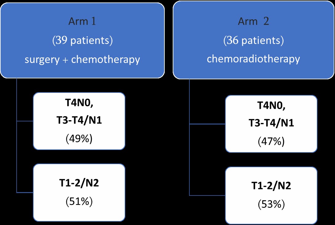 Material and Methods: This retrospective study is based on 75 patients attending two cancer centers in Tbilisi between 2014 and 2016. Patients were treated either with resection followed by adjuvant chemotherapy (Surgical arm) or a regimen of chemoradiation alone (CHRT arm). Kaplan-Meier curves were used to compare survival outcomes between groups, as well as treatment complications were analyzed