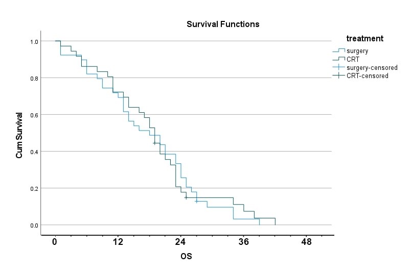 Overall survival for both groups was compared beginning at the date of starting treatment. Survival was assessed from the date of starting treatment until the patient died of any cause. The date of starting treatment for surgical arm was the day of surgery and for CHRT arm the first day of concomitant chemoradiation. Treatment safety was assessed according to the NCI- Common Toxicity Criteria version (CTCAE). Treatment related death was measured as death within 30 days after finishing surgical intervention or chemoradiotherapy in surgical and CHRT arms, respectively.
