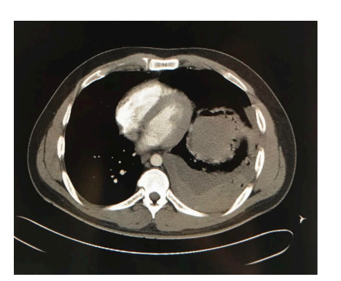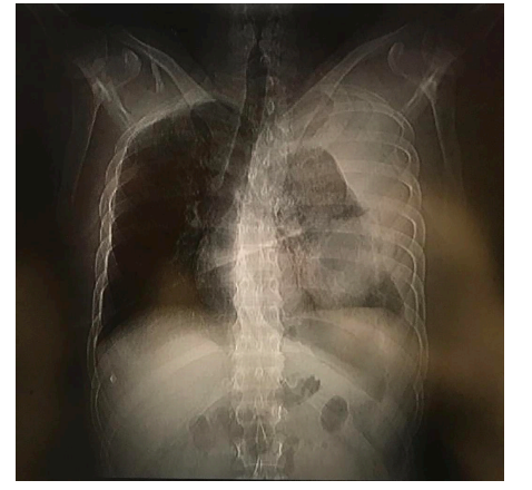 Spontaneous non-traumatic hemopneumothorax has a much higher incidence in males than in females (about 30 times more) [6] with a median age presentation of 22 to 34 years [1], in conformity our patient was a 33- year-old male. The patients with pneumothorax have a higher probability of developing SHP. The escape of air from the lungs into the pleural space in pneumothorax prevents the lungs from expansion and ultimately the lungs collapse leading to severe breathing problem, dry cough, and dyspnea. Accordingly, our patient had left-sided SHP associated with abrupt lung collapse.