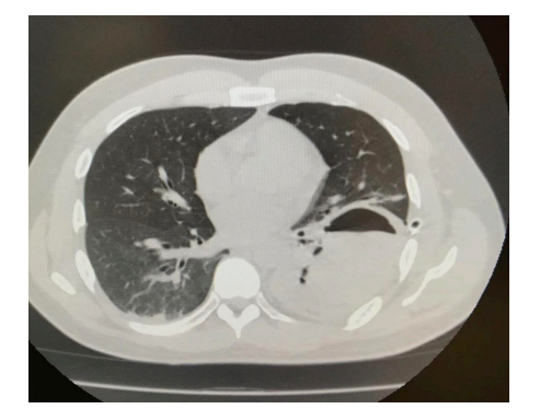 Case presentation: A 33-year-old man who was brought to the emergency room with a history of dry cough, chest pain, shortness of breath, weakness, dizziness, and hemoptysis of five days evolution. Physical examination detected marked reduction of breath sounds on the left hemithorax. A chest X-ray showed apical pneumothorax and pleural effusion. Computed Tomography scan detected the presence of a thick-walled cavitary lesion, bronchopleural fistula, and a complex hemorrhagic left-sided hemopneumothorax associated with lungs collapse. An emergency left-sided thoracostomy was performed. Besides, antifungal and antibiotics were administered and surgical excision of the lower lobe. There was a complete resolution of the patient’s symptoms and post-op images showed expansion of the lungs and prevention of further hemoptysis.