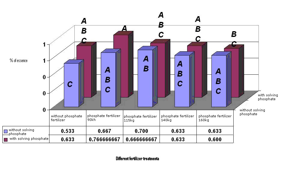 Among the treatments (figure 2), P90PS1 with average 0.77% had maximum percentage of essence and P0PS0 with 0.53% had minimum percentage of essence. Results show that mixed application of the phosphate organic fertilizer with phosphate fertilizer has lead into increase in the percentage of essence comparing with phosphate fertilizer. This increase had equal performance at different levels, therefore the interaction between the agent of various quantities of phosphate fertilizer and the agent of the phosphate solving organic fertilizer have no meaningful difference.