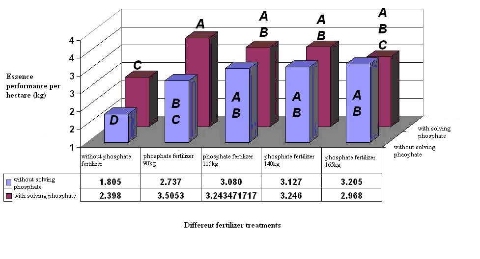 Study on the interaction (between the agent of various levels of phosphate fertilizer and the agent of the phosphate solving fertilizer) in different strains show that there was meaningful difference among the strains of flower branch length, number of flower branch, performance of wet shoot yield of aerial organ at (α = 0.01), as well as the height of bush and performance of Dry matter of aerial organ at (α = 0.05). There was no meaningful difference in the seeds performance strains, essence percentage and its performance (table 2).