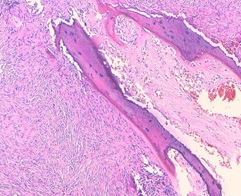 The biopsy is made easy with endonasal endoscopy. The SFT diagnosis is supported by a characteristic immunohistochemical profile [19,20]; Macroscopically, the tumor is well limited and often encapsulated and translucent. The size varies generally between 1 cm and 25 cm [21]. At the cut, the surface appears fasciculate and lobulated. Its color is often greyish, sometimes pink-white [21]. Histologically, the tumor is made of a dense proliferation of fusiform cells, dispersed orderly, and supported by a frame of collagen fibers of variable abundance. It is characterized by branching hemangiopericytoma- like vessels. The main signs of malignancy are represented by a high mitotic index (greater than four mitoses per ten fields at high magnification), a high cell density, necrotico- hemorrhagic changes, marked nuclear pleomorphism and vascular invasion [22 -25]. The immune- histochemical study of SFT classically shows diffuse expression of vimentin and CD34, variable expression of CD99 and bcl-protein and negativity of the epithelial marker (cytokeratin, EMA) and of the protein S100 [26]. Intense and diffuse nuclear staining of STAT-6 is highly characteristic of SFT, seen in more than 90%of the cases [27]. Some factors of poor prognosis have been reported as the loss of expression of the CD34 antigen, the high expression of Ki67 (MiB1), and of the P5protein [28].
