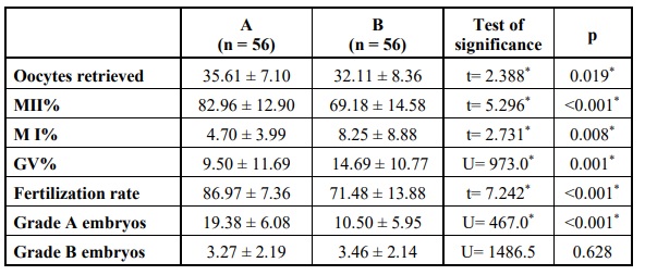 More oocytes were retrieved in group A with more mature oocytes in group A and more MI and GV oocytes in group B and the differences were statistically significant. Also, the fertilization rate and good quality embryos were significantly higher in group A Table 6.
